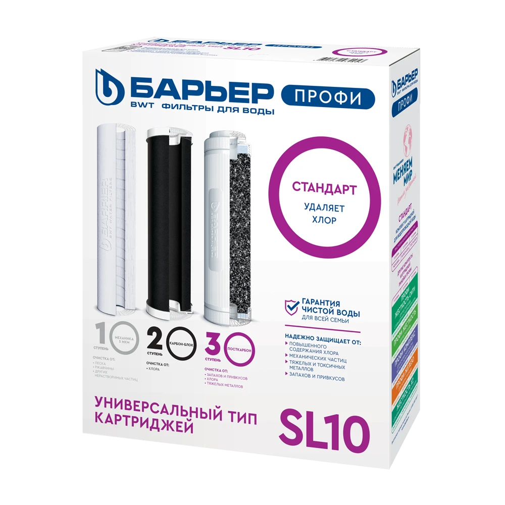 Комплект фильтрующих элементов для трехступенчатых систем водоочистки («Профи Standart») одля комплексной очистки воды от основных видов примесей. Картриджи стандарта SL 10 обеспечивают базовую доочистку городской воды от побочных продуктов хлорирования, тяжелых металлов, нефтепродуктов и т.д. Устраняют неприятные привкусы и запахи. Производительность - 2 л/мин.