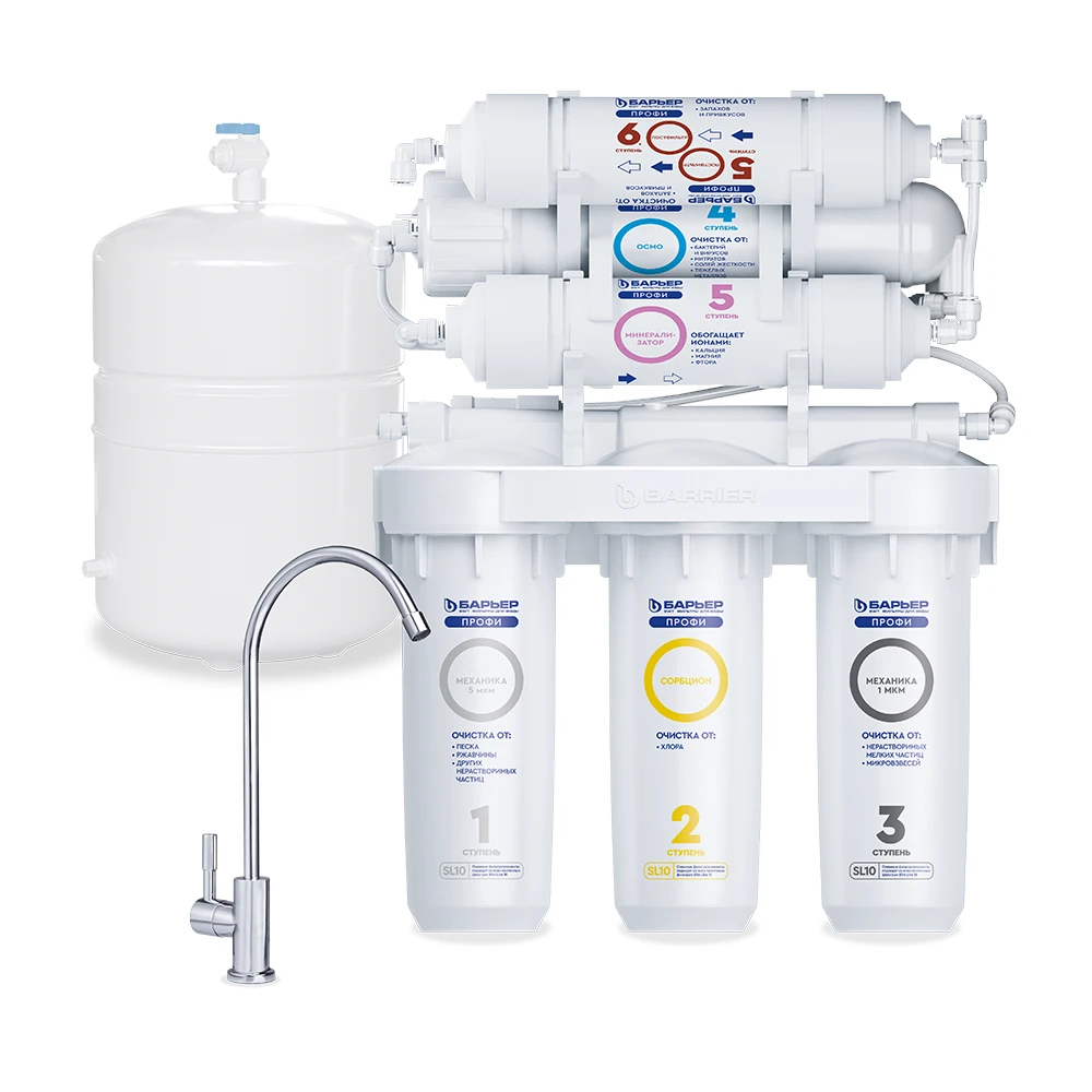 Системы обратного осмоса БАРЬЕР очищают воду путем ее прохождения через 6 ступеней очистки.