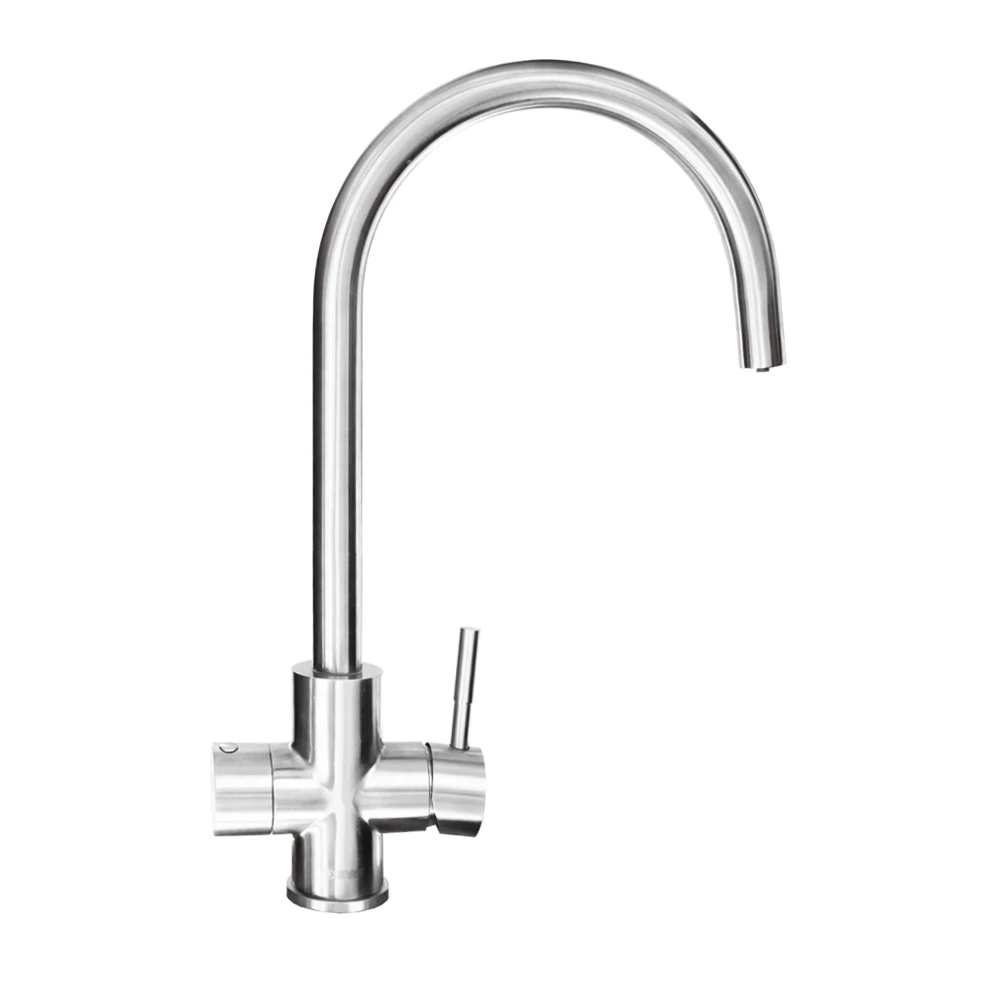 Смеситель из нержавеющей стали с функцией подачи фильтрованной воды в классическом дизайне. Экономит пространство на кухне за счет совмещенной системы подачи водопроводной и очищенной воды и подойдет тем, не готов сверлить дополнительное место под кран с отфильтрованной водой.