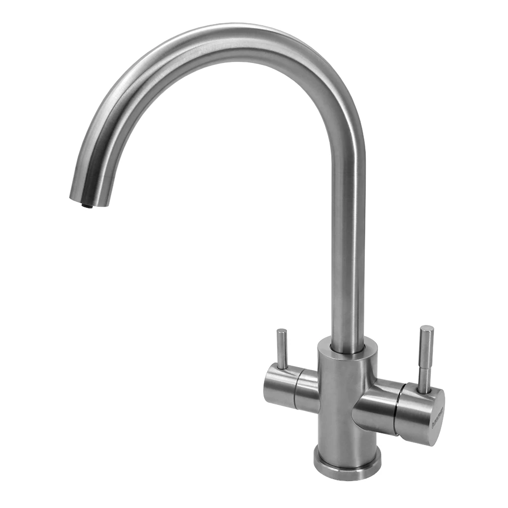 Компактный комбинированный смеситель из нержавеющей стали с изливом высотой 33,7 см в классическом исполнении с приятным сатиновым полуматовым блеском. Экономит пространство на кухне за счет одновременной подачи водопроводной и фильтрованной воды в одном кране.