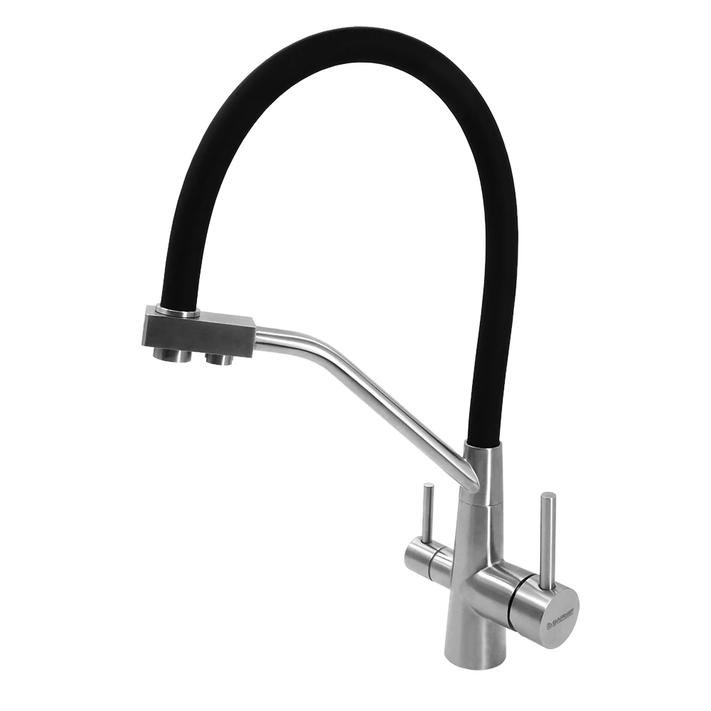 Компактный комбинированный смеситель из нержавеющей стали с гибким изливом черного цвета высотой 42,8 см с приятным сатиновым полуматовым блеском. Экономит пространство на кухне за счет одновременной подачи водопроводной и фильтрованной воды в одном кране. Встроенный аэратор уменьшает расход воды, а гибкий поворотный излив добавляет комфорта в использовании.