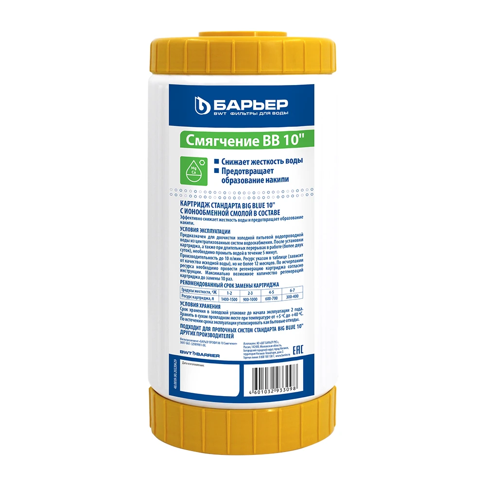 - Универсальность — сменный картридж БАРЬЕР Смягчение Big Blue 10″ подходит для магистрального фильтра любого производителя при условии фактического соответствия универсальному стандарту Big Blue 10″.