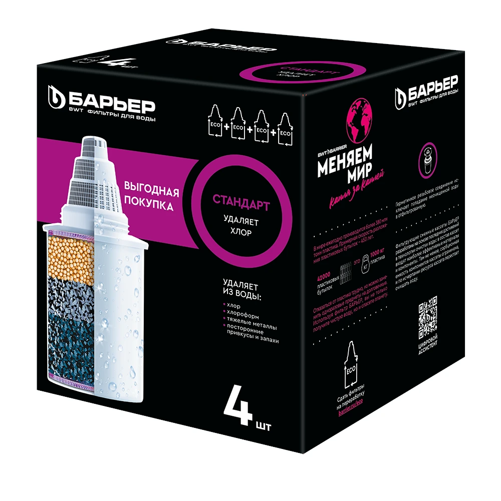Описание комплекта из четырех сменных кассет Стандарт для фильтра-кувшина Барьер