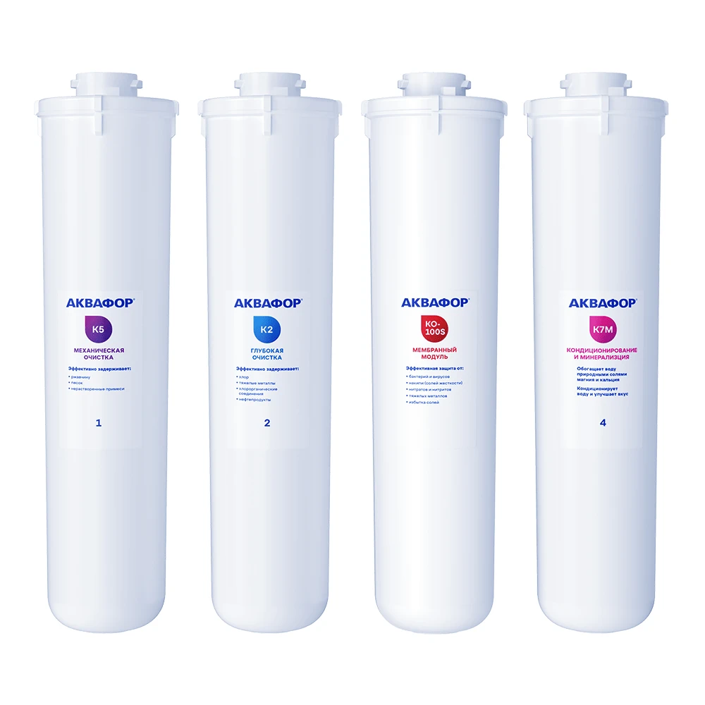 В комплект входят четыре модуля: K5, К2, К7M, мембранный модуль КО-100S*. Модули К5 и К2 предназначены для использования в блоке предварительной водоподготовки водоочистителя Аквафор Морион. Первым по ходу движения воды устанавливается сменный модуль предварительной очистки воды К5, вторым - сменный модуль К2.