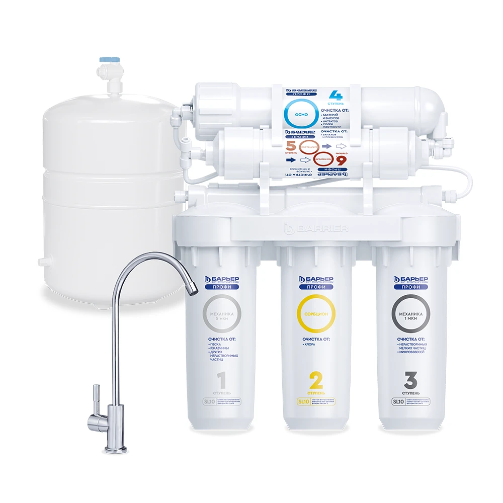 Системы обратного осмоса БАРЬЕР очищают воду путем ее прохождения через 5 ступеней очистки.