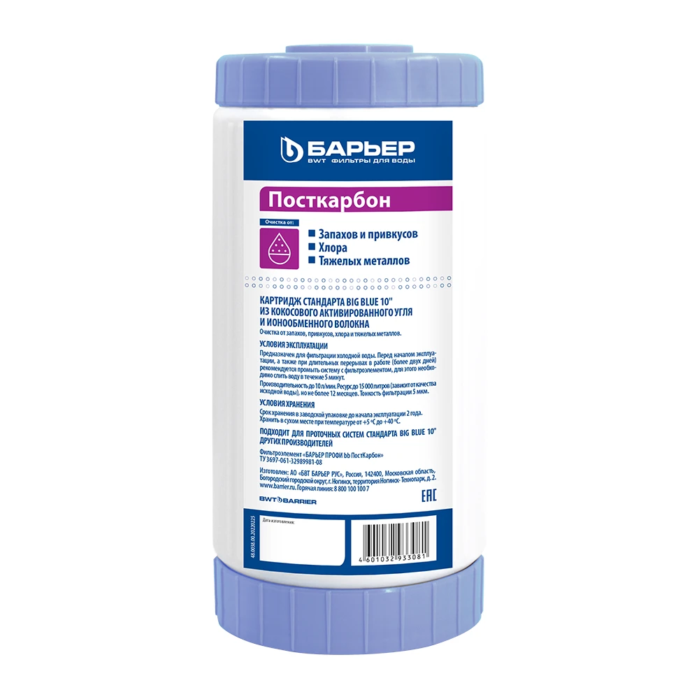 Сменный элемент Барьер Посткарбон стандарта Big Blue 20" повышенной производительности. Предназначен для финишной очистки холодной воды от примесей хлора и хлорорганических соединений, а также устранения неприятных запахов и улучшения вкуса воды.
